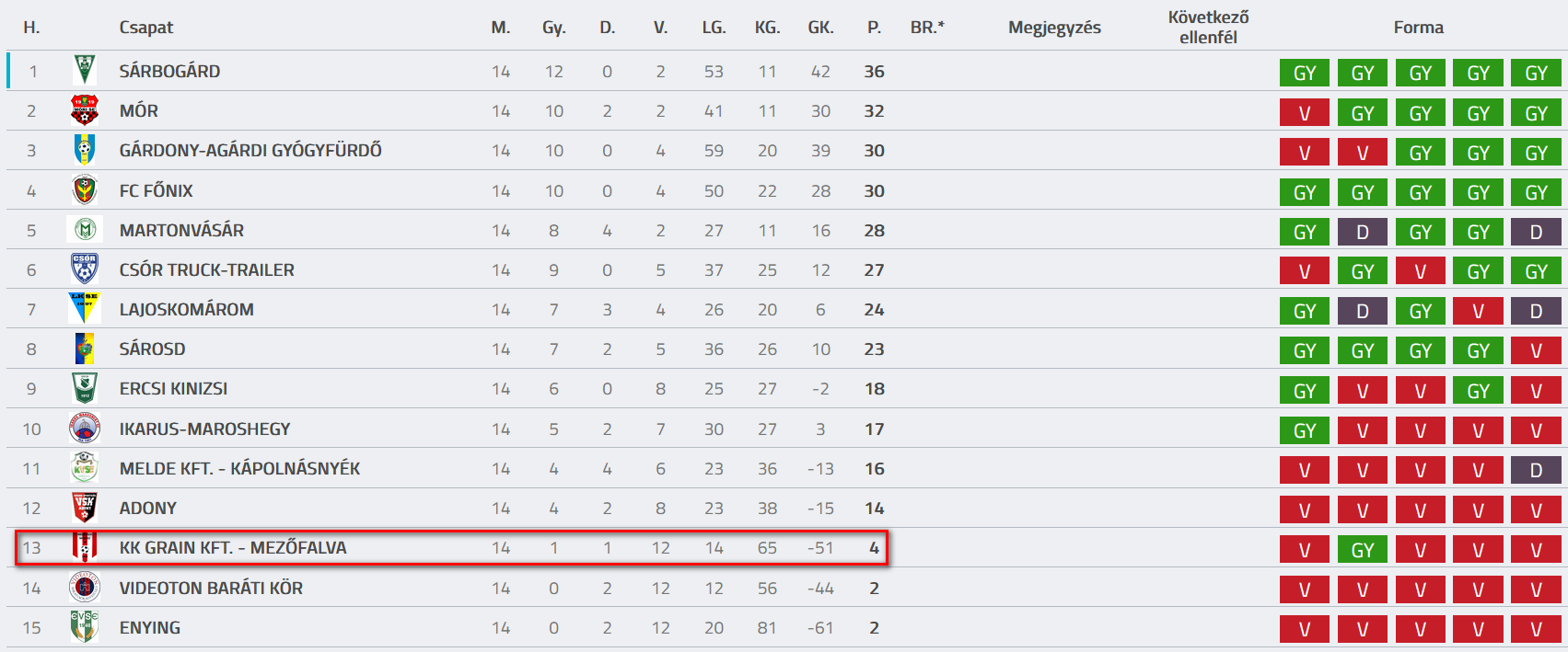12. forduló: KK Grain Mezőfalva SE - Sárosd 0:3 (0:2).