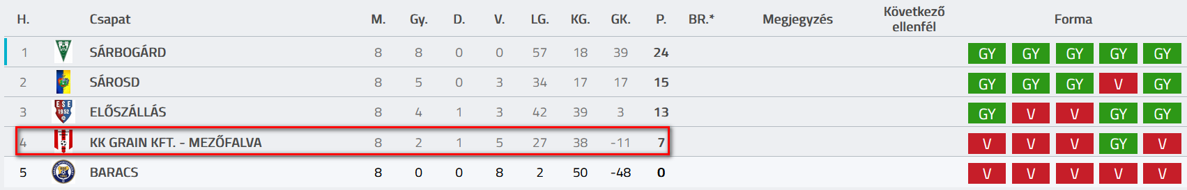 5. forduló: KK Grain Mezőfalva SE - Sárosd 0:6 (0:0).